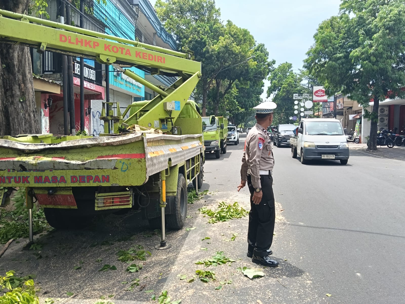 Kasat Lantas Polres Kediri Kota, AKP Afandy Dwi Takdir, S.T.K., S.I.K., menjelaskan bahwa pihaknya melakukan pemantauan langsung proses pemangkasan yang dilakukan oleh tim DLHKP, sekaligus memberikan imbauan kepada masyarakat yang melintas di sekitar lokasi.